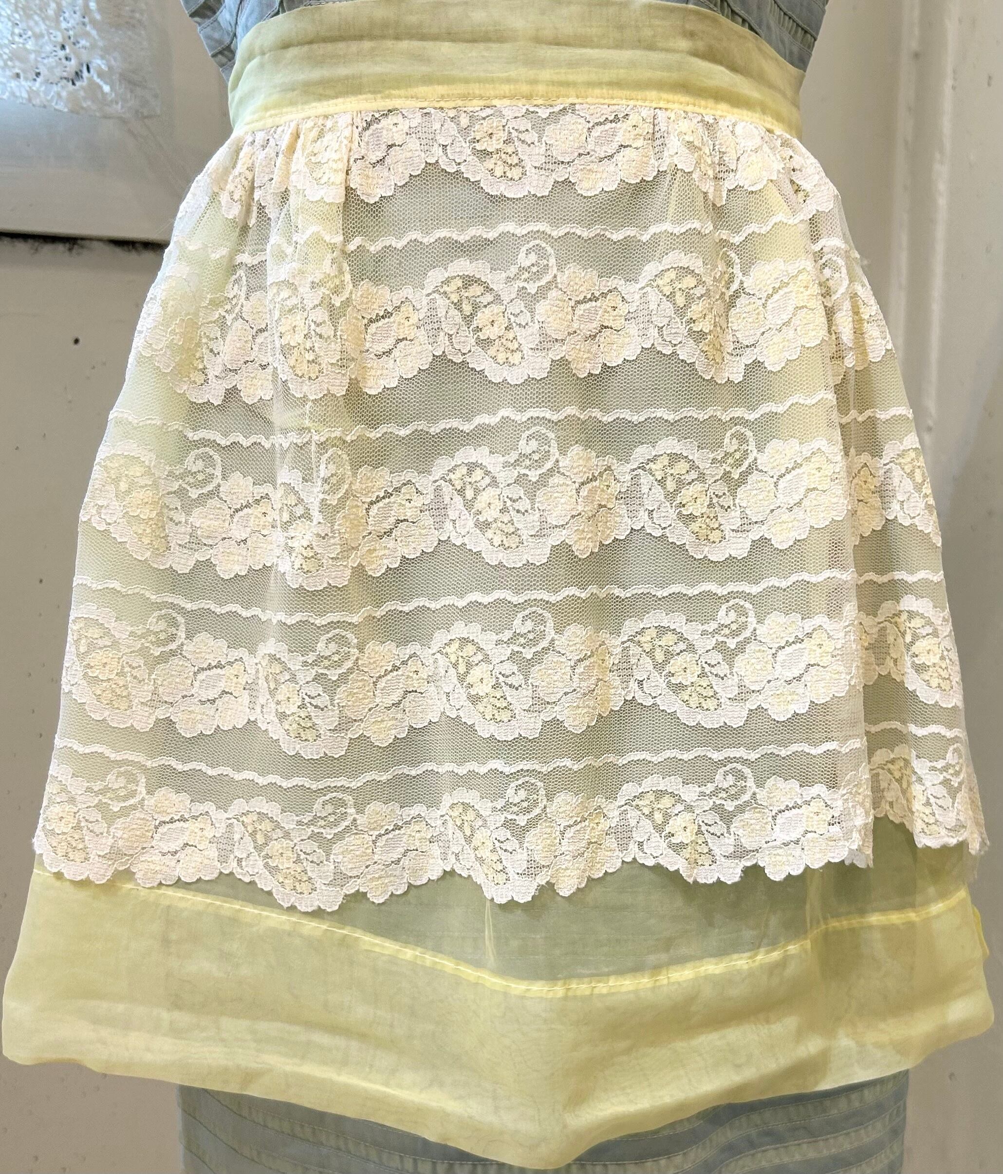vintage yellow organdy white lace apron with pocket