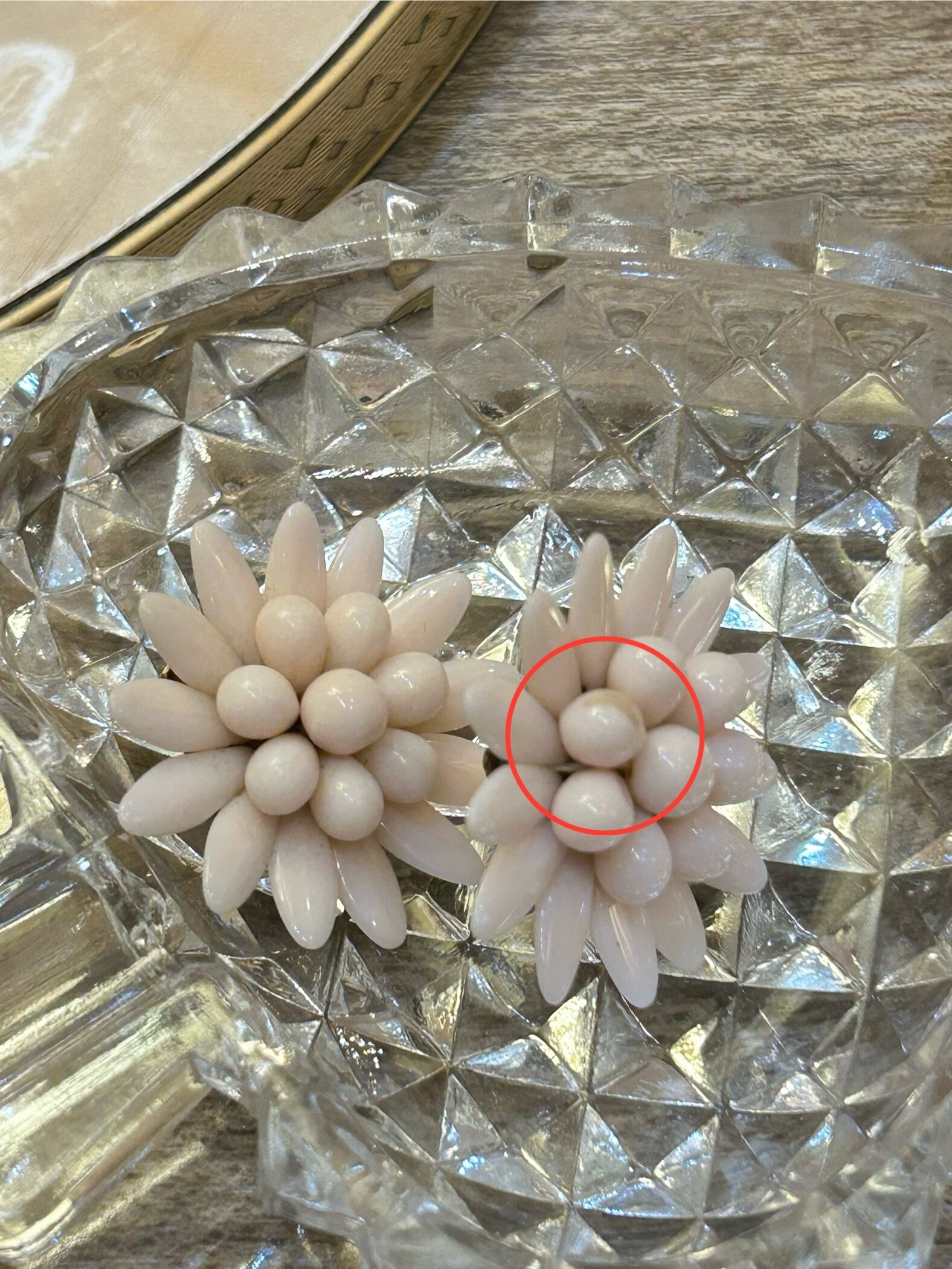 花びらの一枚にくすみと、クリップ部分に剥がれがあります。(写真参照)