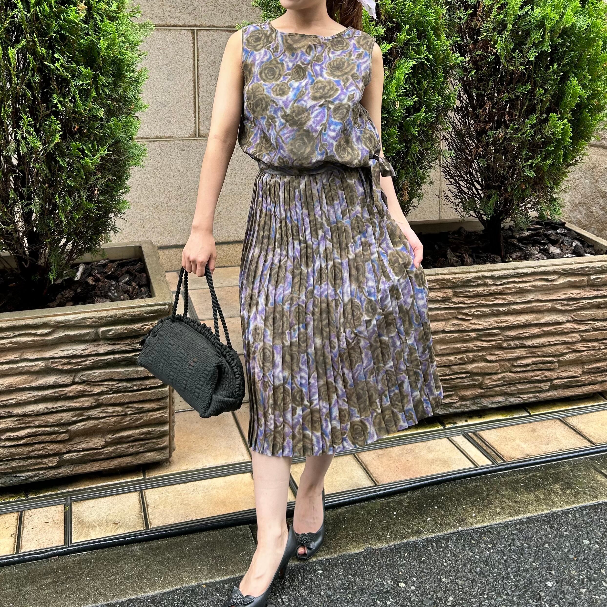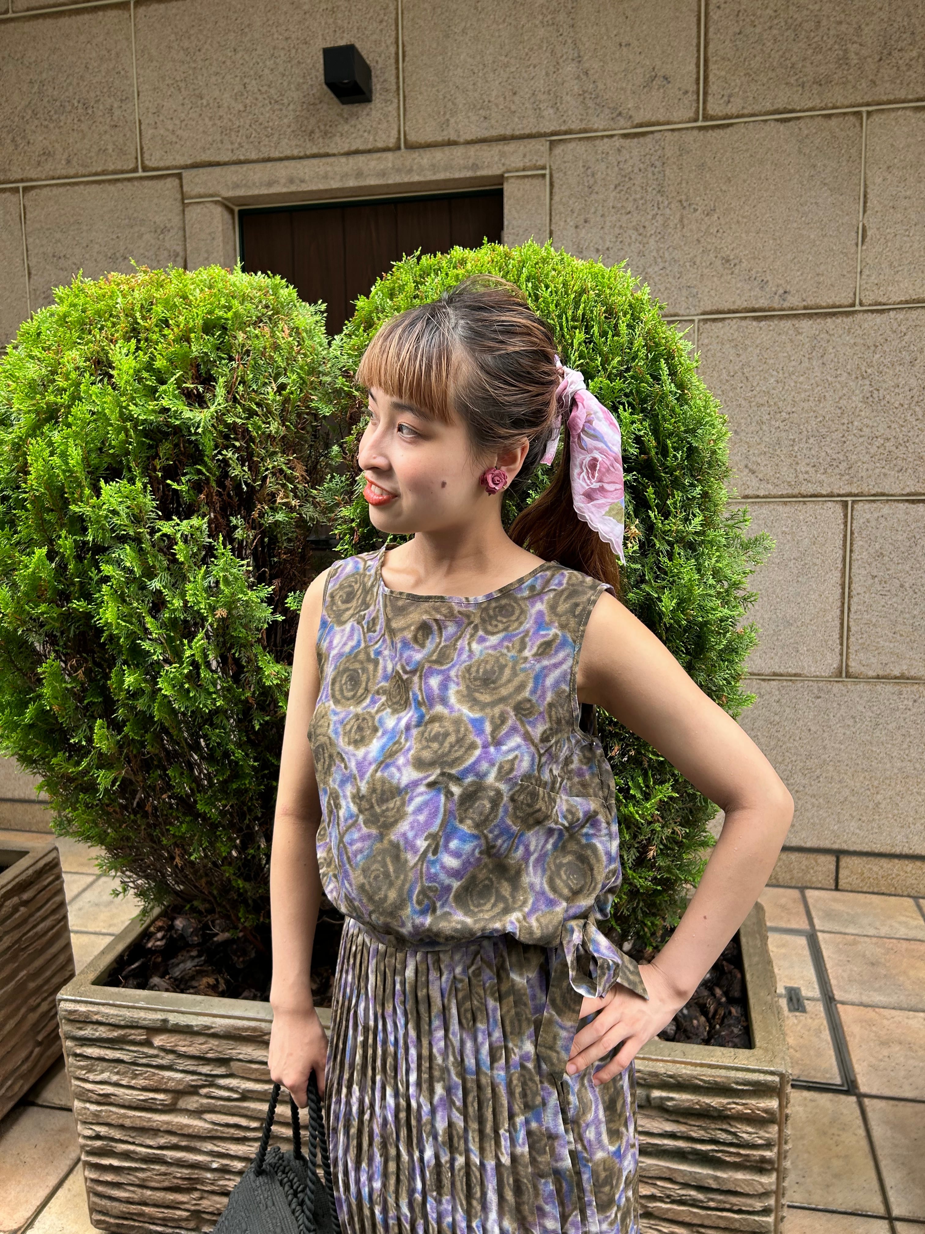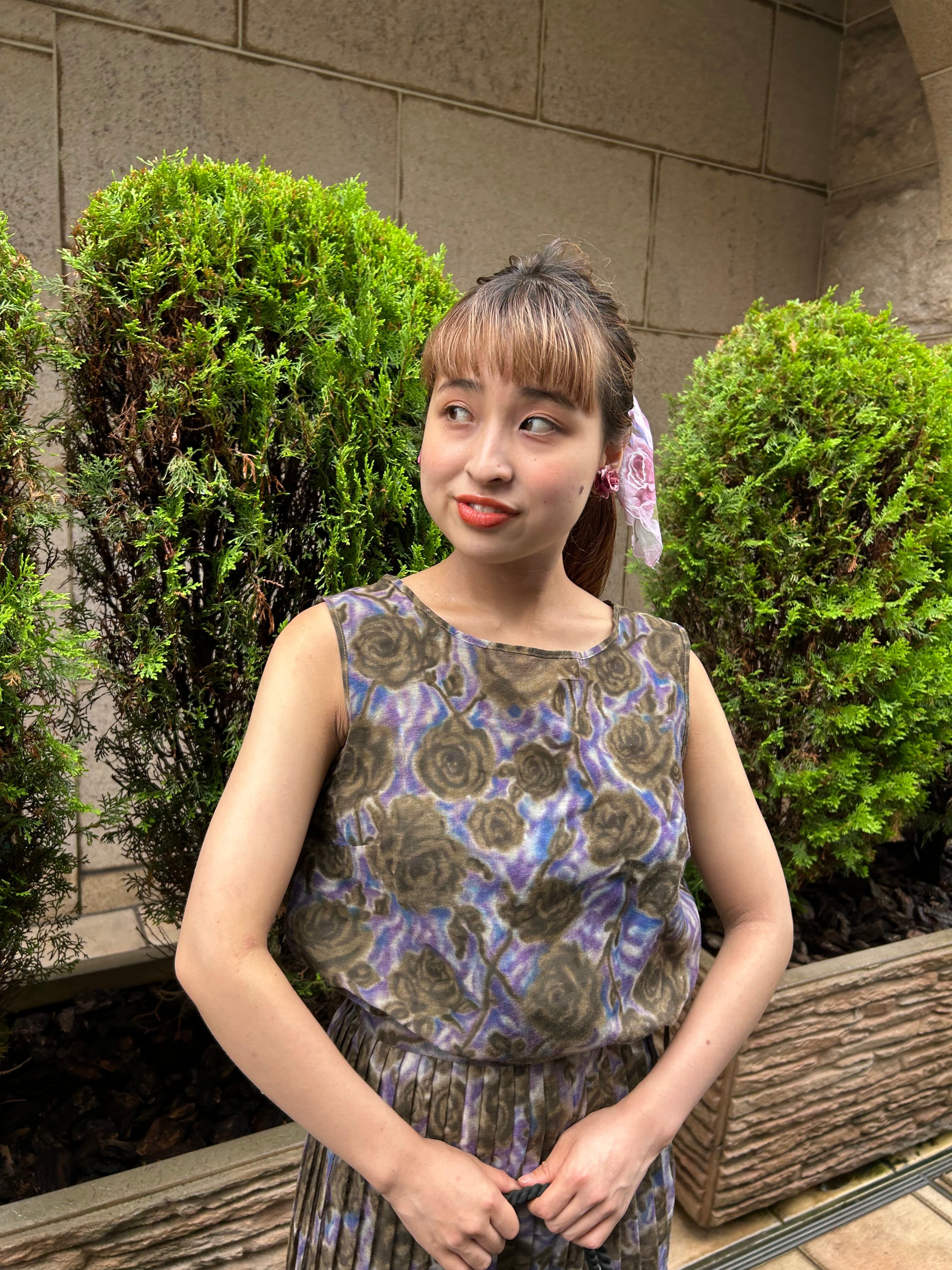 水彩画のようなタッチで描かれたブラウンとパープルのローズが美しく、ノースリーブでも上品に着こなしていただけます♪