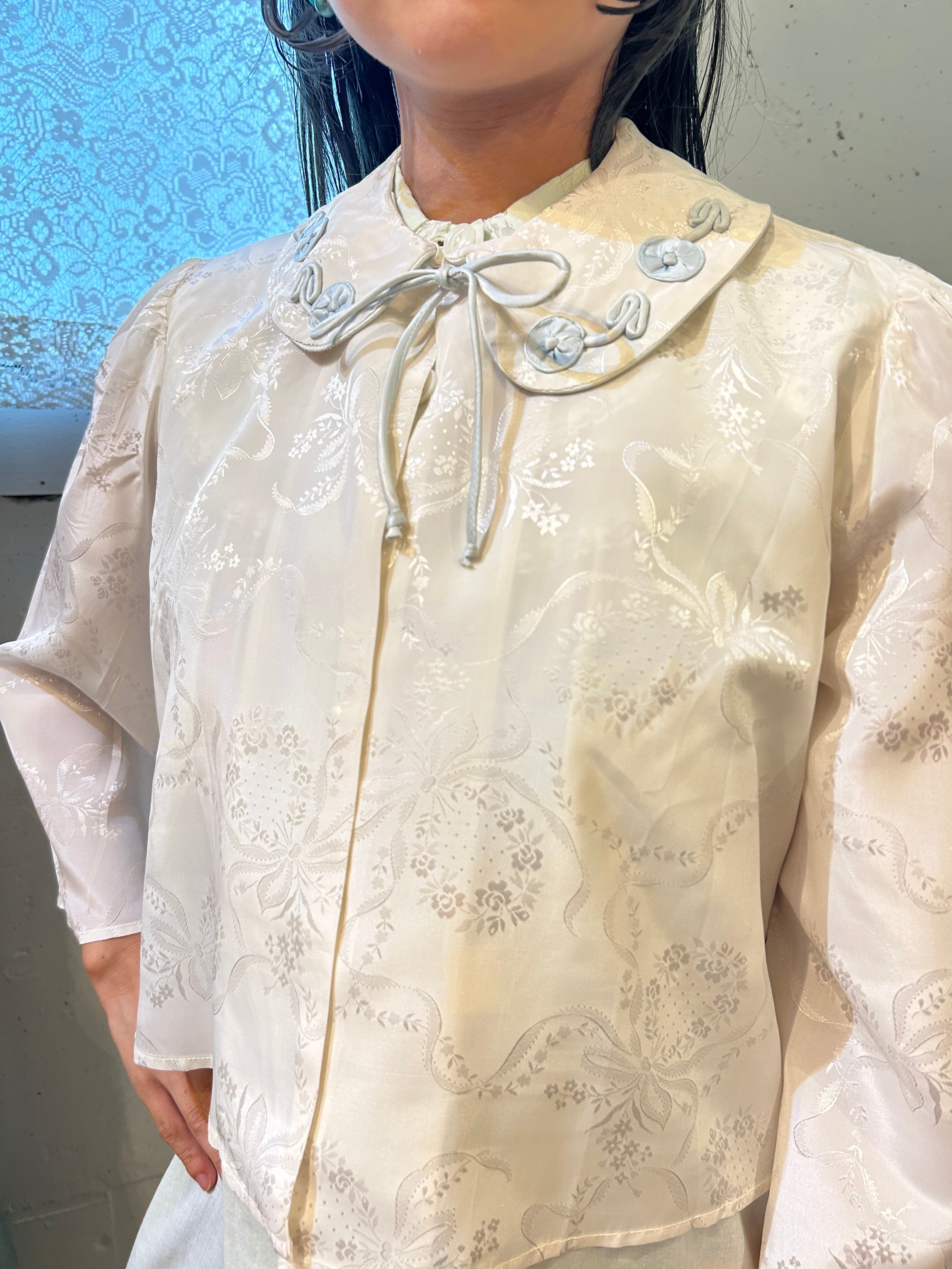 ラウンドカラーにはキルト刺繍のようなお花が装飾さ れており、胸元のサテンリボンも上品です♪