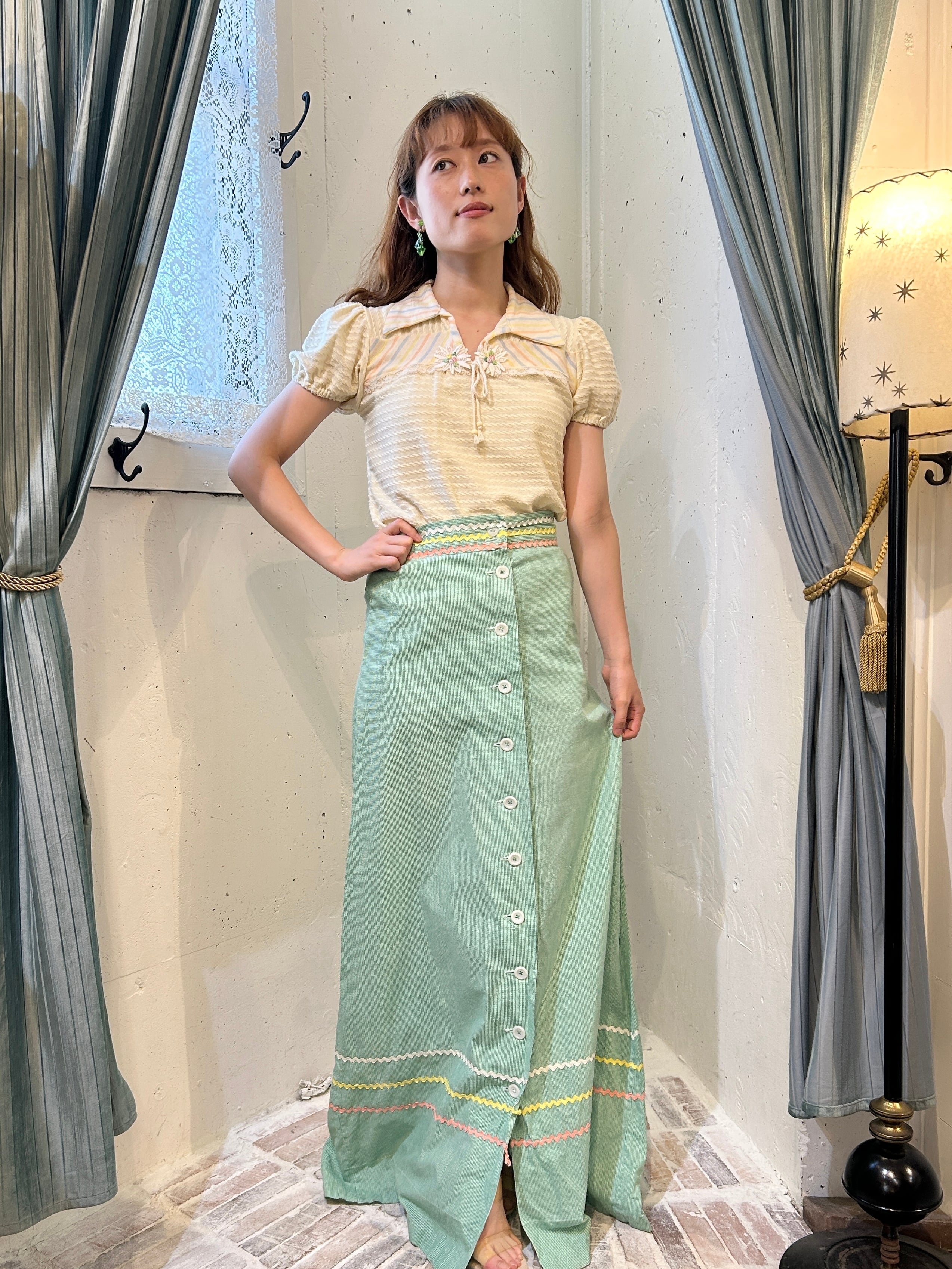 細かいストライプになっているグリーンカラーのマキシ丈スカートです♪