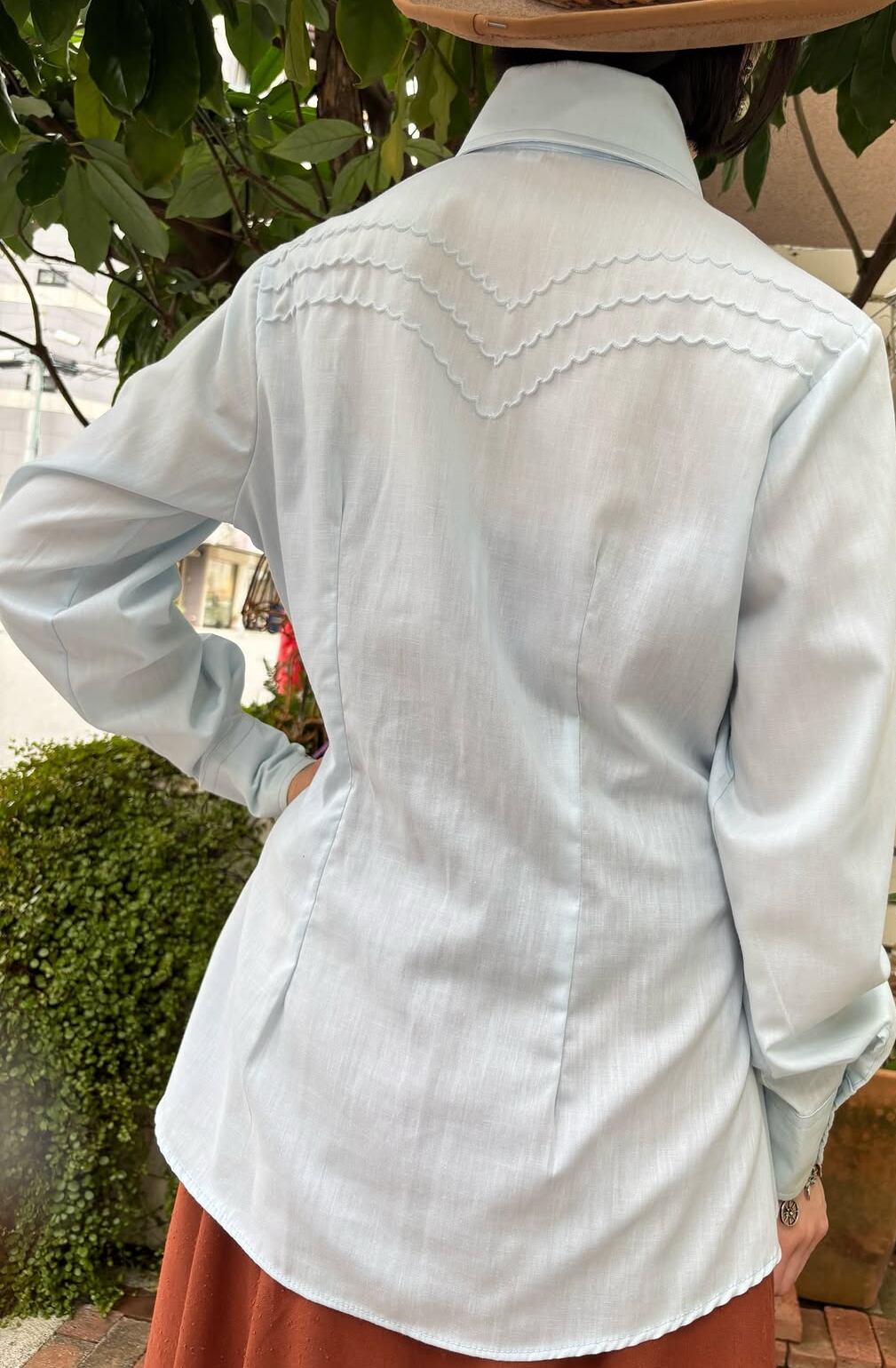 ペールトーンなブルーと前身頃とヨークの波のような刺繍がフェミニンな印象!