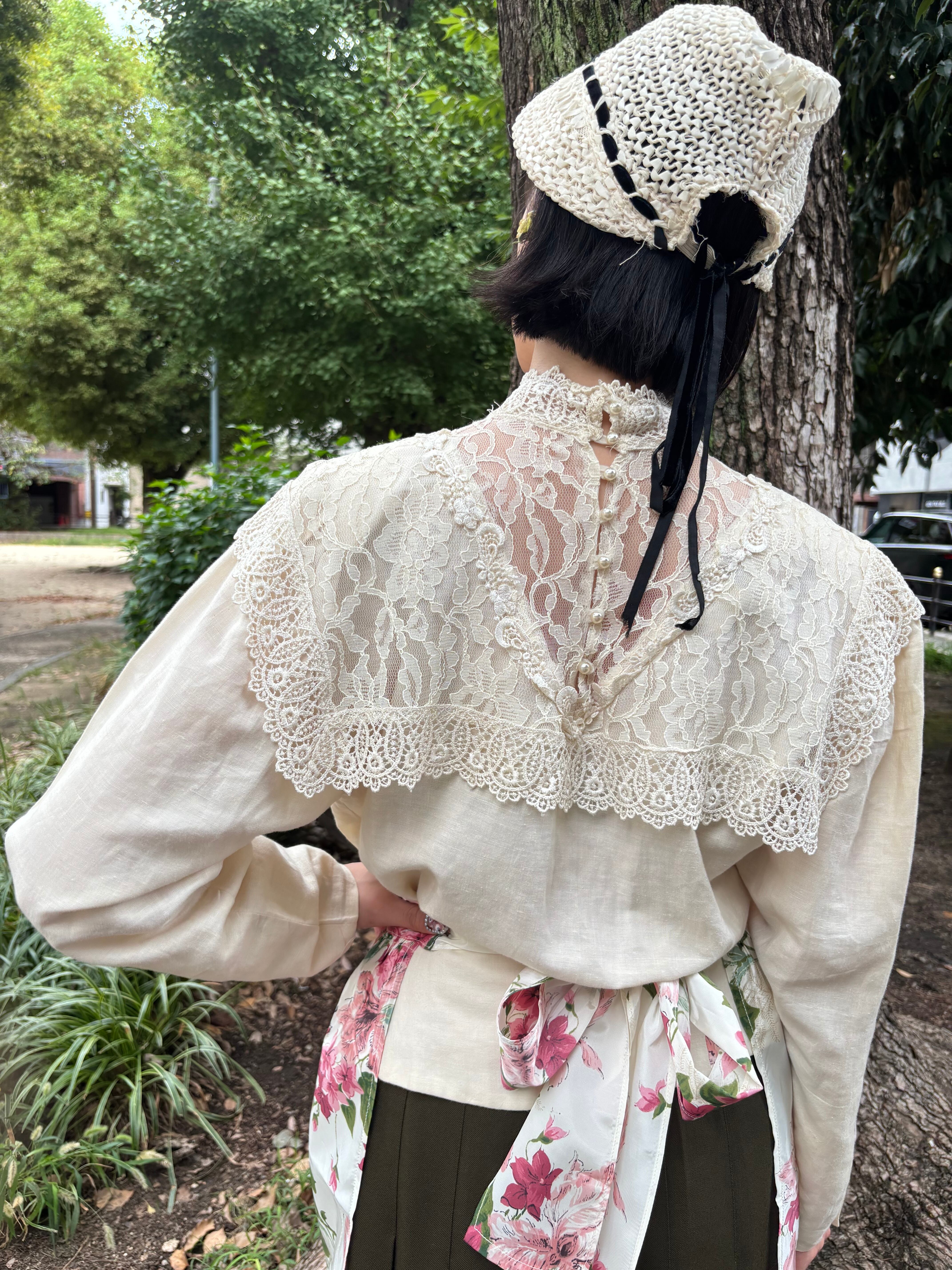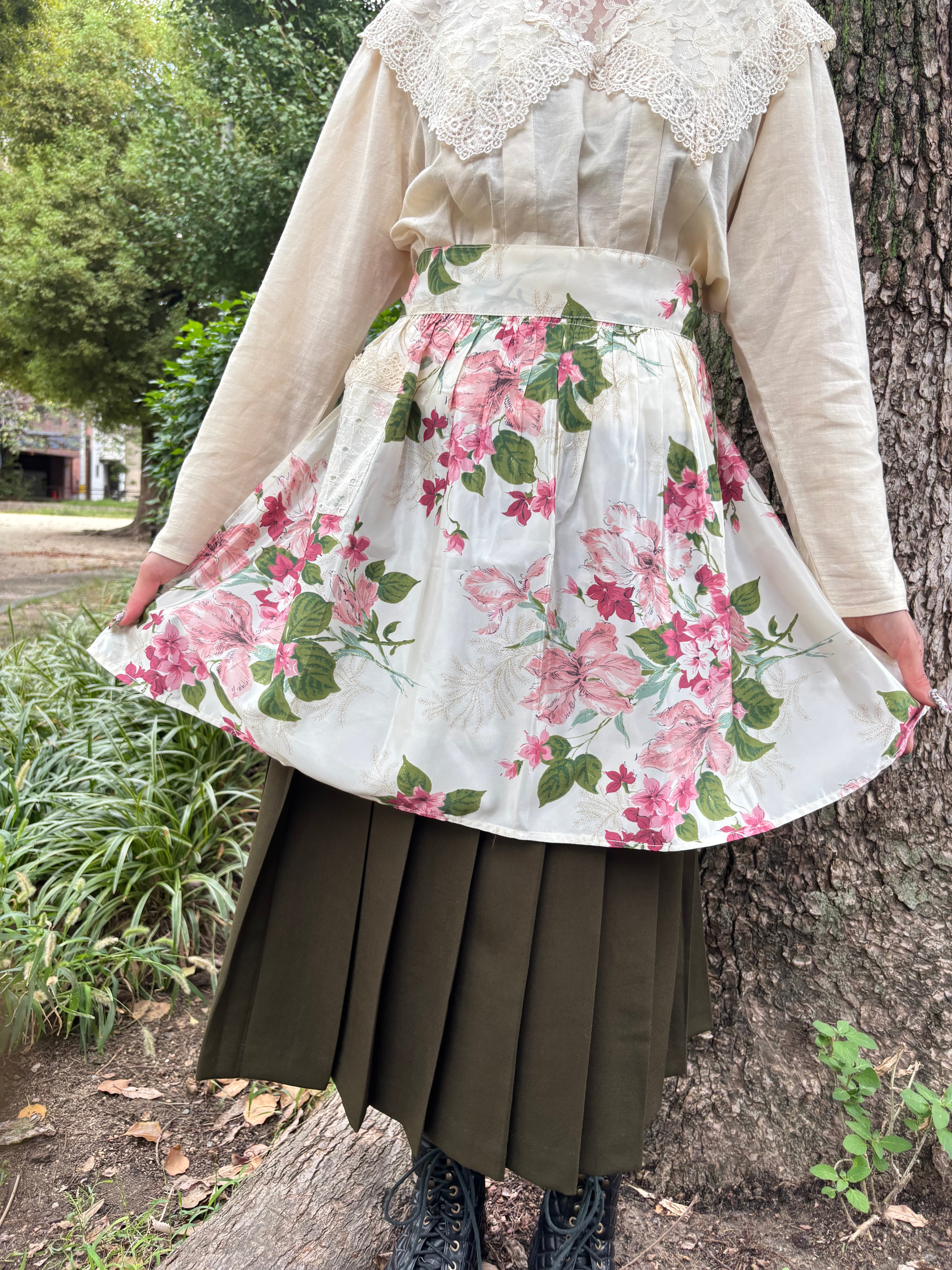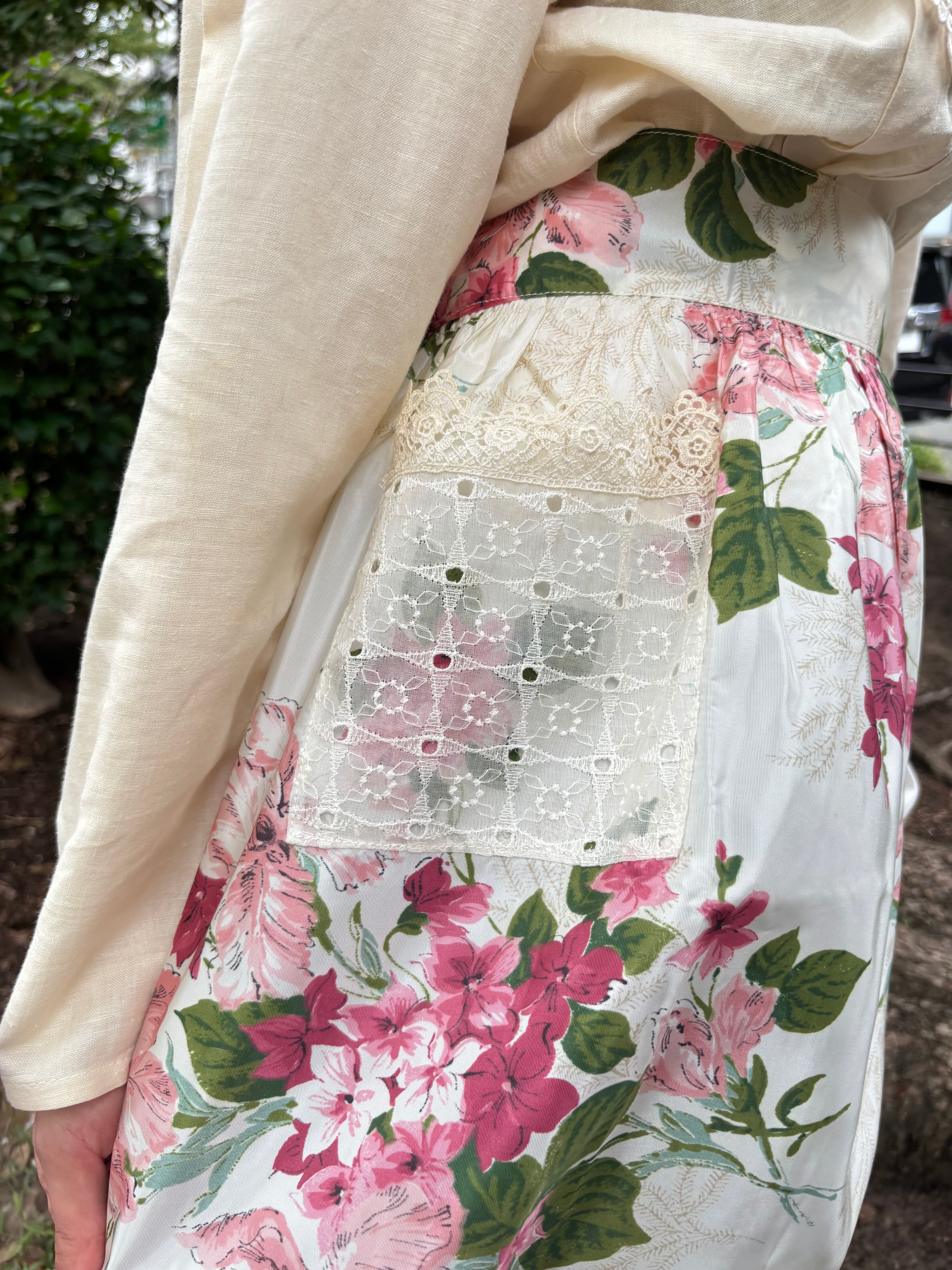 vintageエプロンでは珍しいツヤ感のある生地です♪ポケット部分のレースにも乙女心をくすぐられます◎