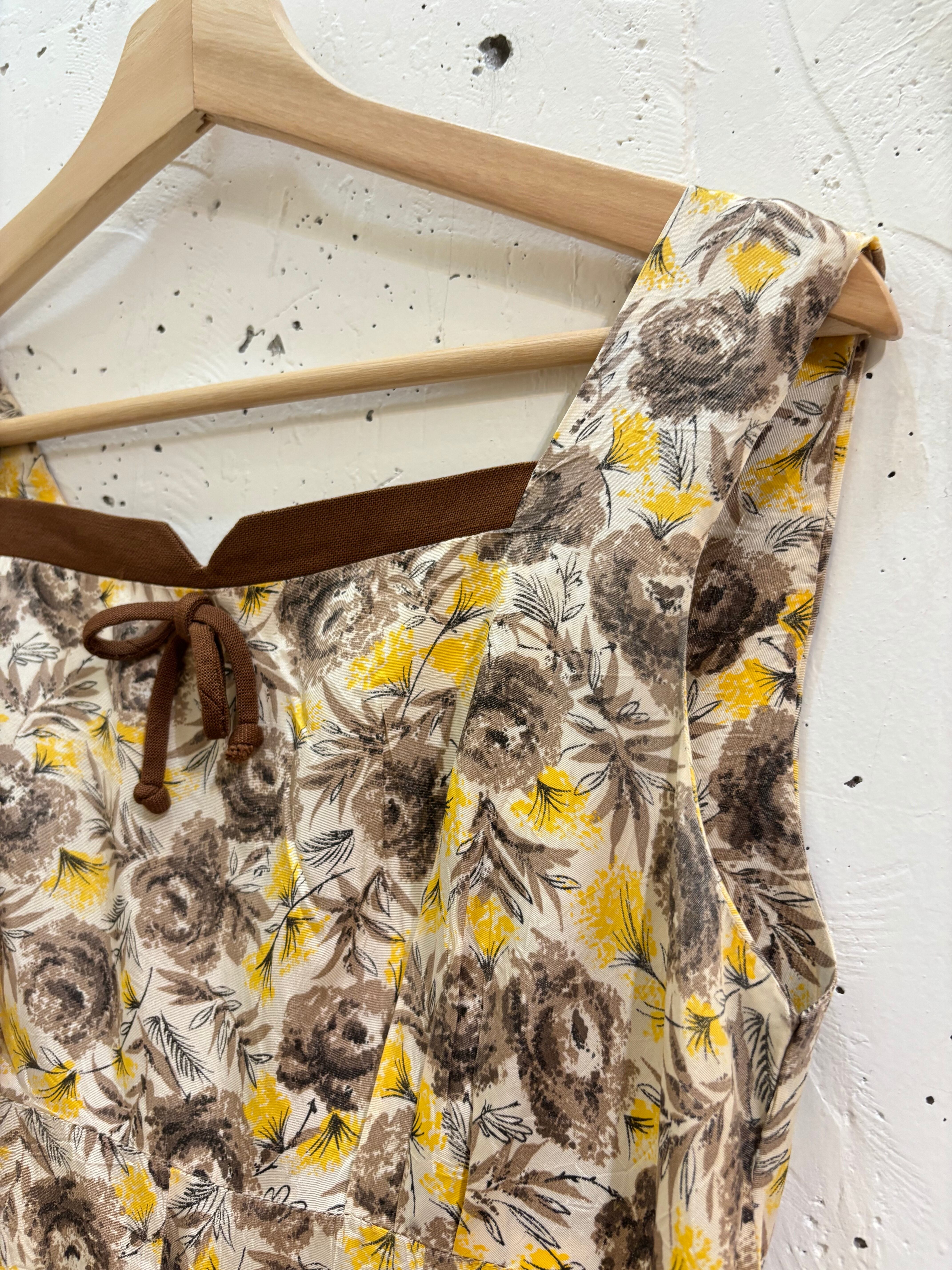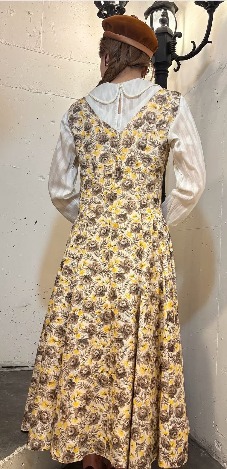 なんといってもこの唯一無二な美しい柄に惹かれますね♪優しいイエローの綿毛か葉のような模様にブラウンのローズ♬掠れ感のあるタッチも40’s 50’sらしいですね◎