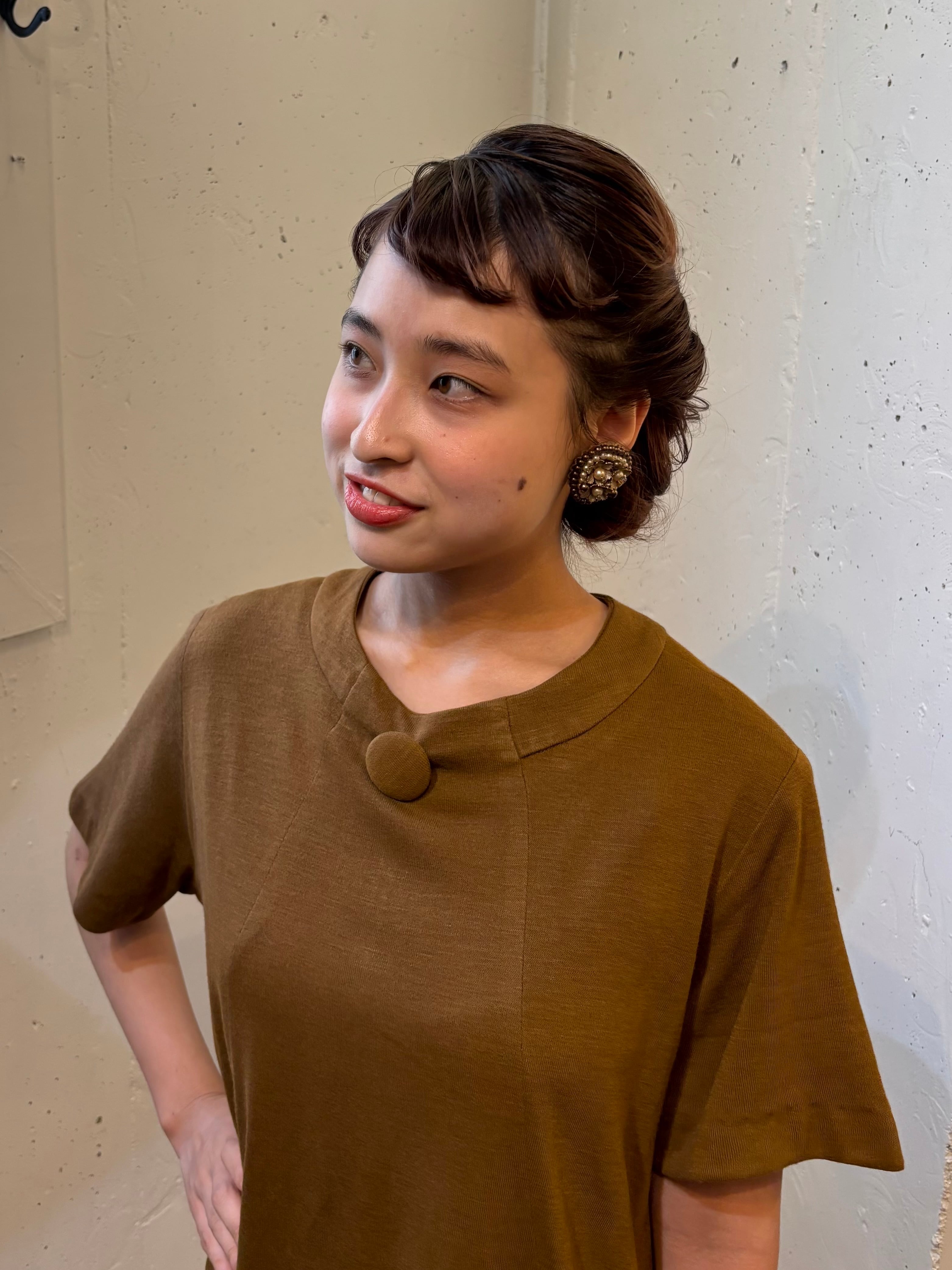 ストンとしたシルエットが60’sらしいドレスです♩半袖ですがウール素材なので写真のようにカーディガンなどどコーディネートして秋冬も楽しんでいただけます◎