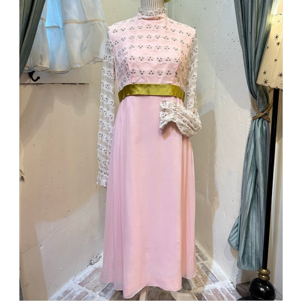 ベビーピンクとグリーンのリボンの60's 70's dressです✨