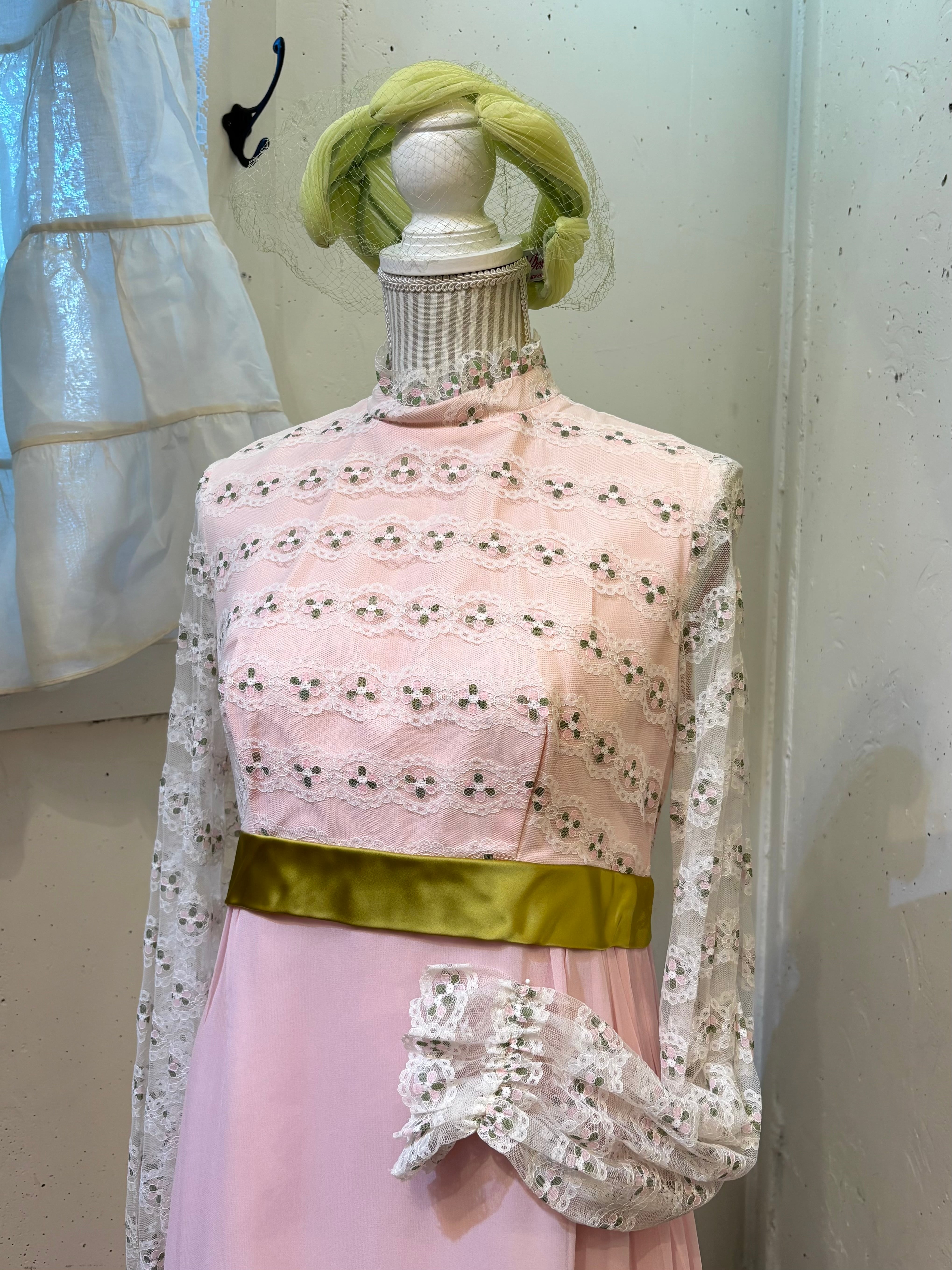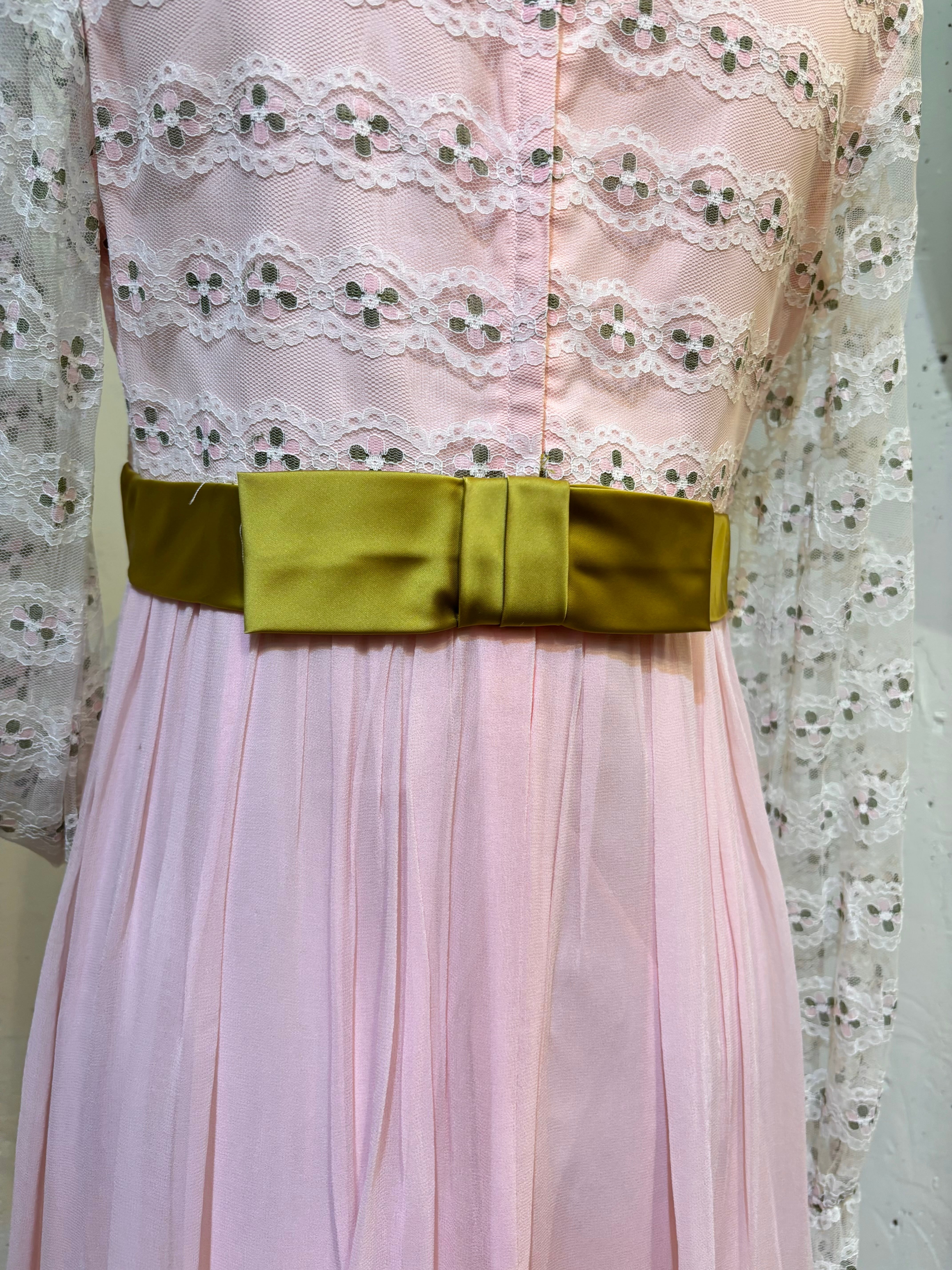 60’s 70’s vintage flower lace green satin ribbon dress