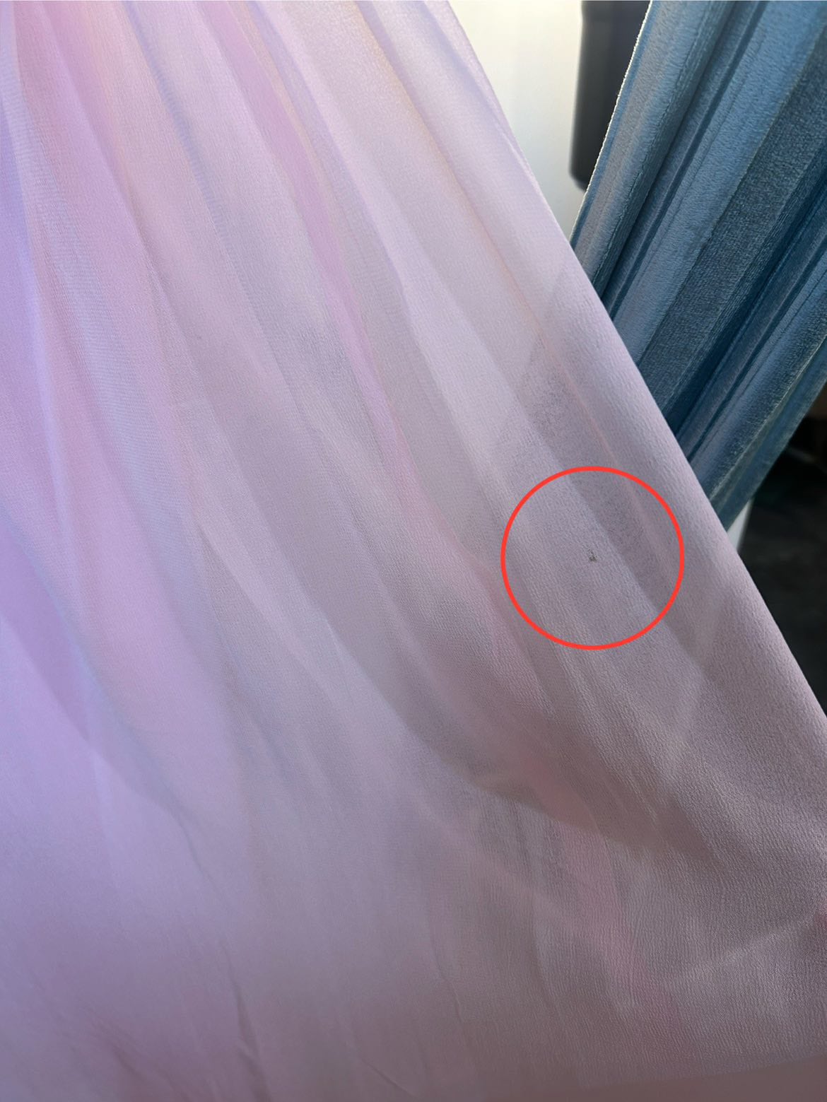 同じピンクカラーの生地が重なっていますのでそれほどは目立ちませんが、背面オーガンジー部分に小さな穴が数カ所あります。(写真参照)