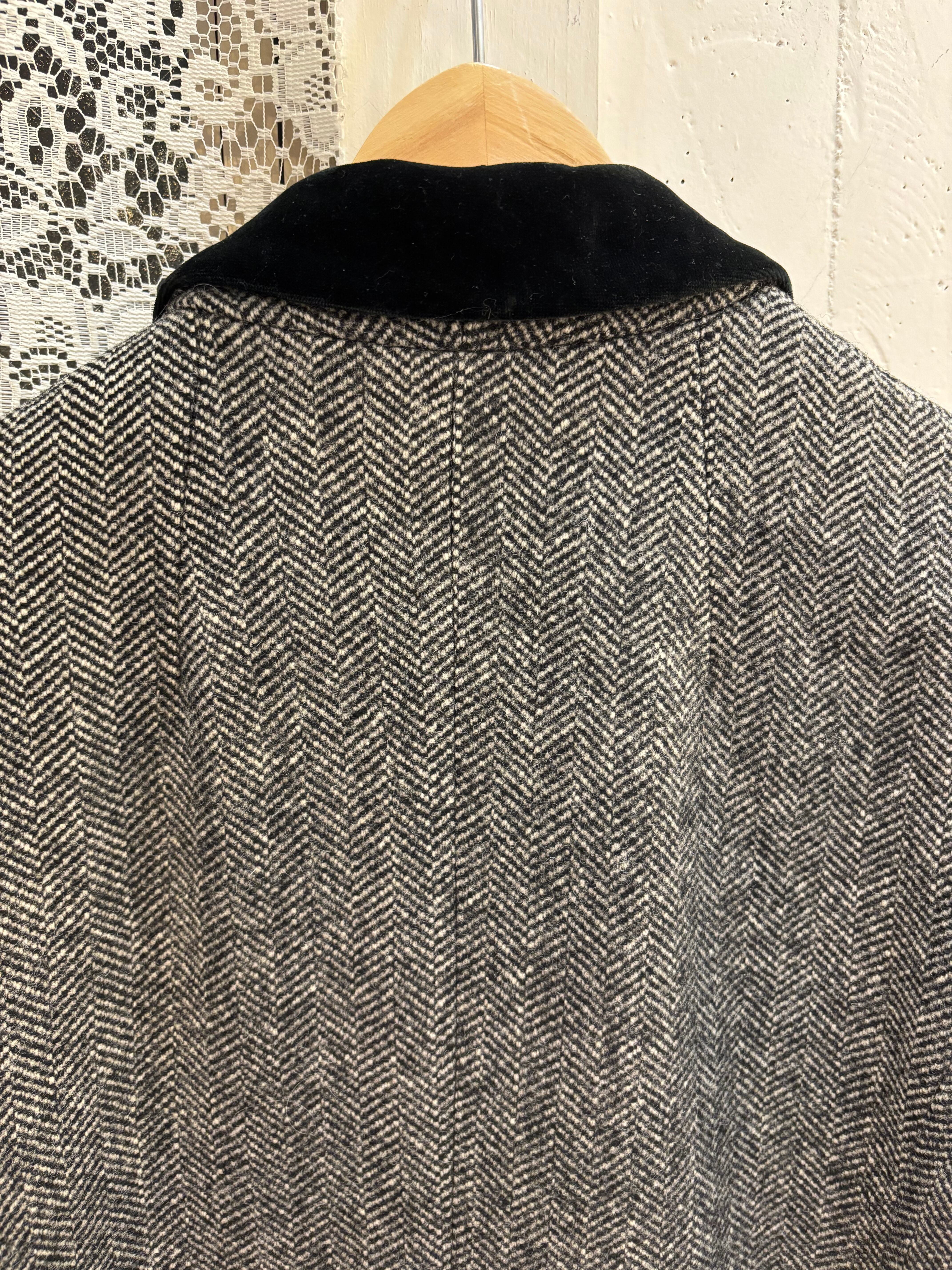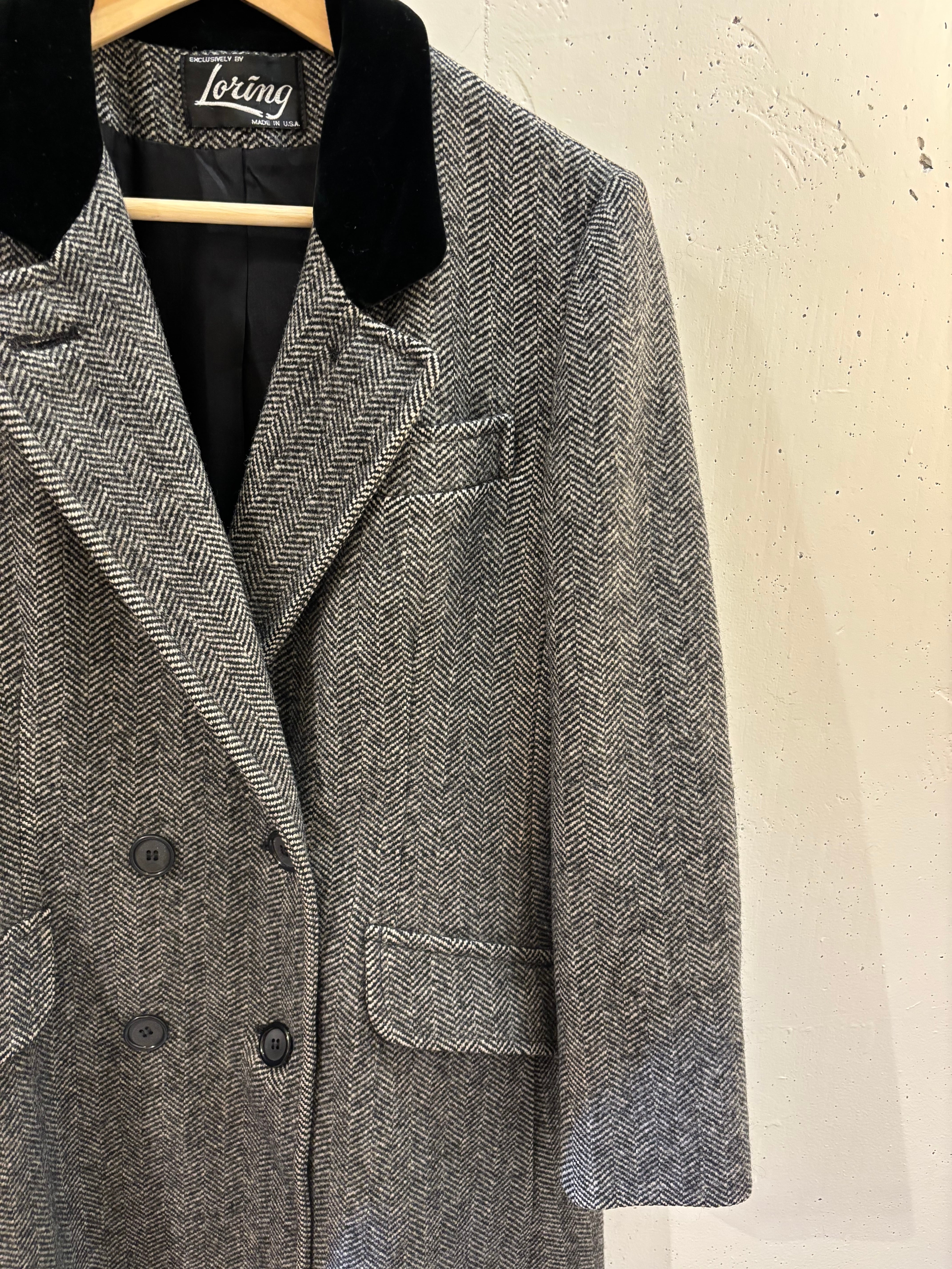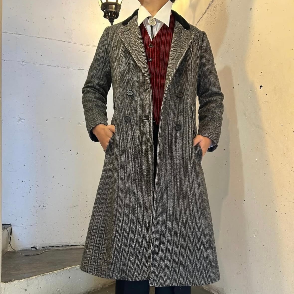 小柄な男性や女性にももちろんおすすめのツイードチェスターコートはヘリンボーン生地に襟元のみベルベットが装飾された上品なデザインです♪