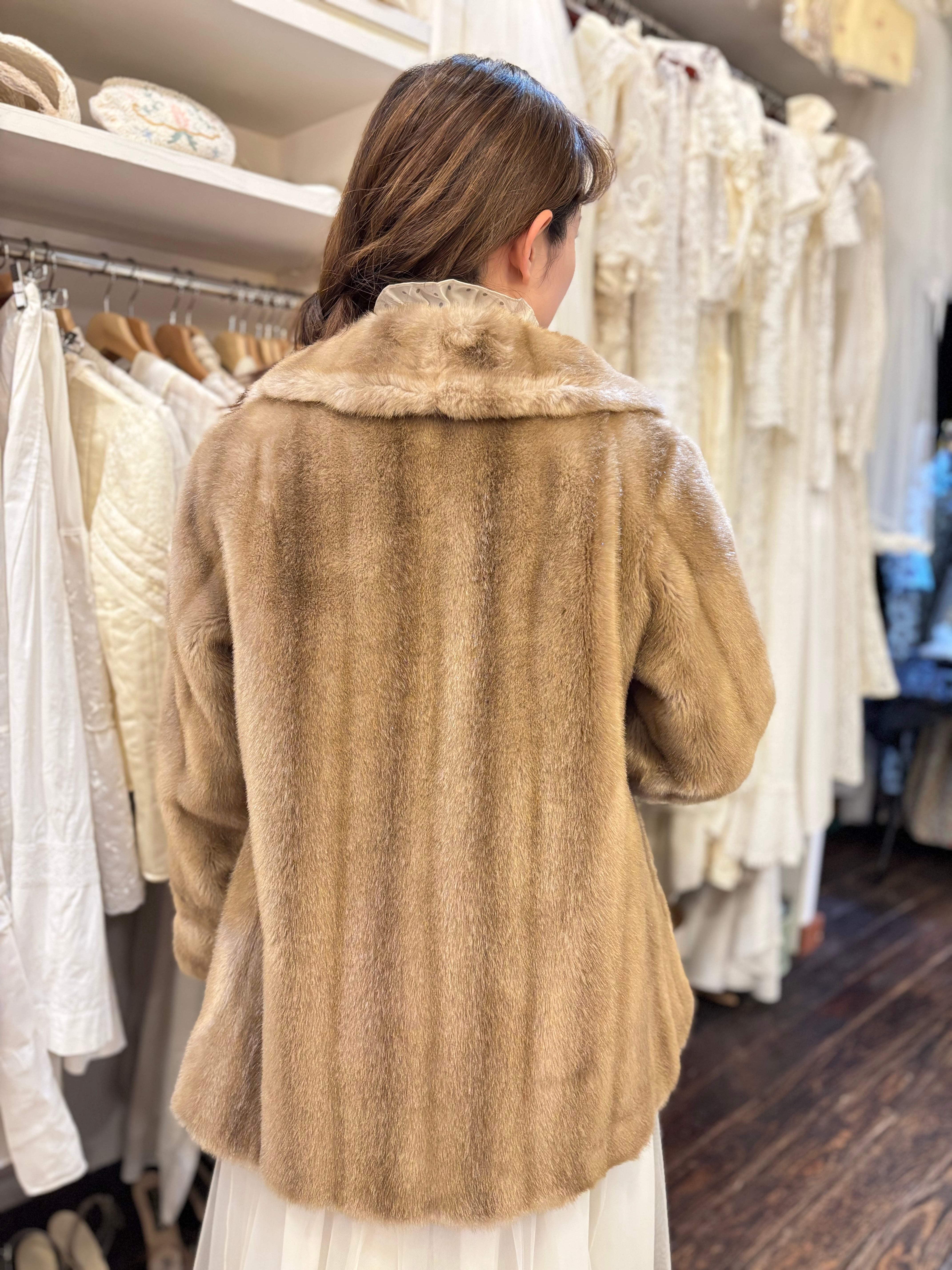 優しいベージュカラーのフェイクファーコートです♪