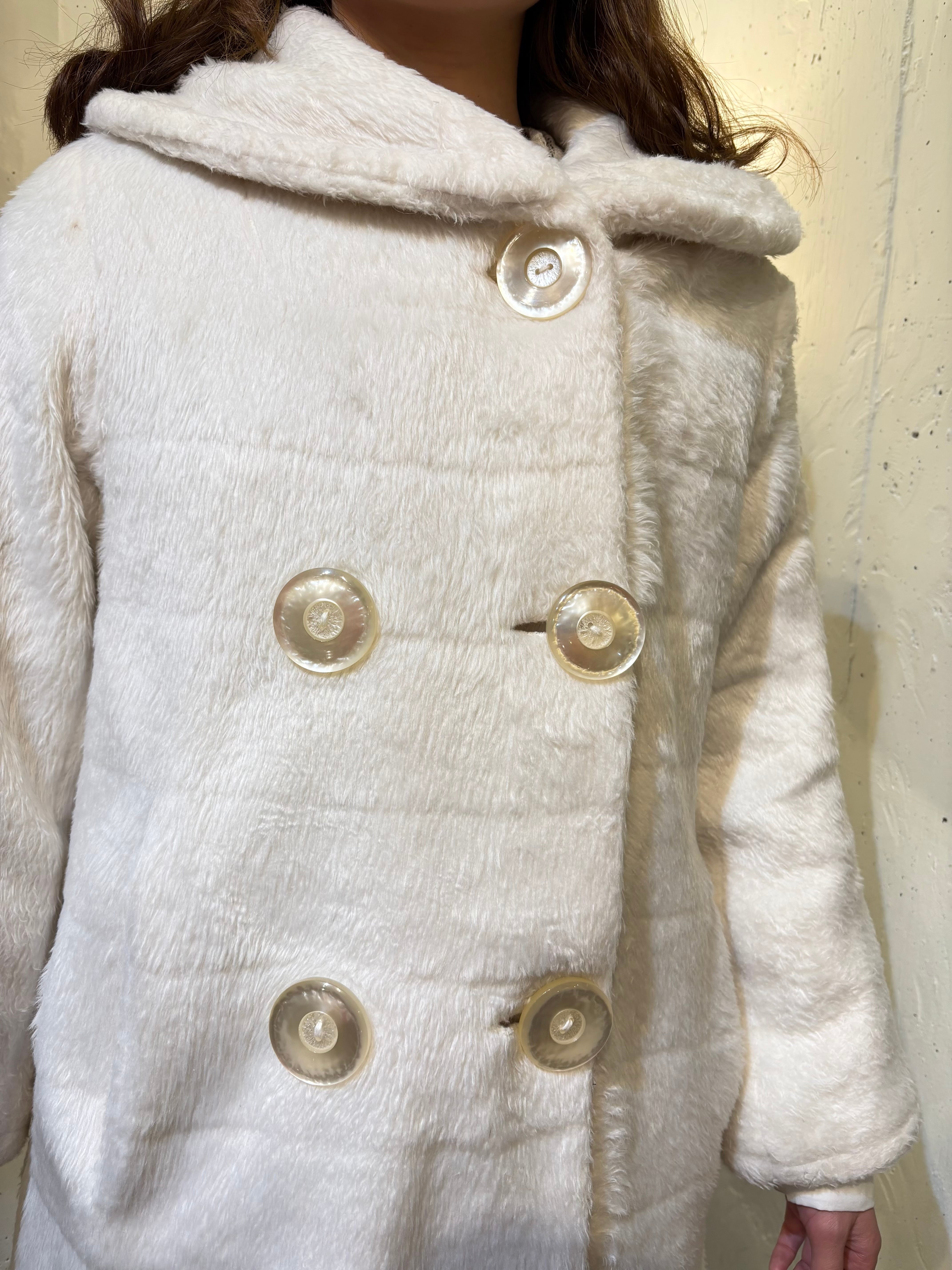 毛足の短いフェイクファーと大きいツヤっとしたボタン、ショールカラーがキュートなコートです♪