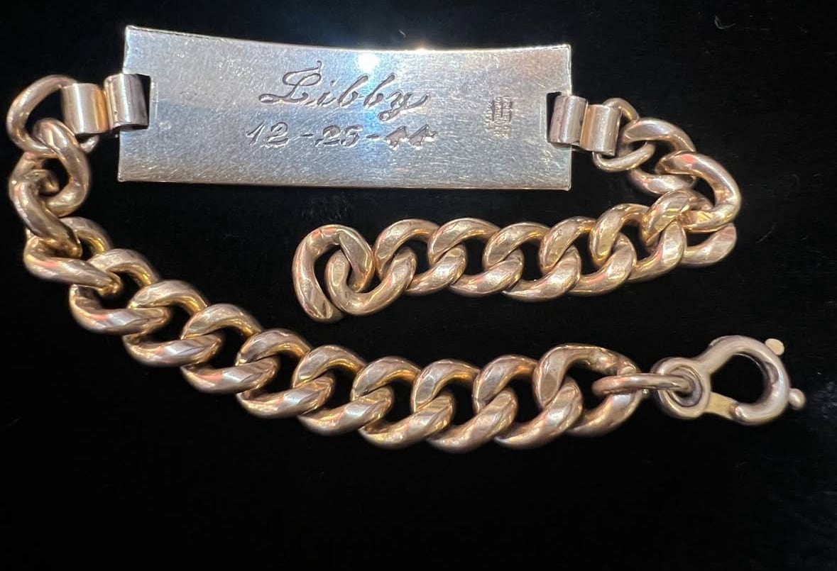 1944年12月25日のレタリングと1/20 12K GF SILVERの刻印の入ったミリタリーIDブレスレットを入荷いたします。程よい大きさと厚みのプレートはシルバー台に12金張りの美品です。