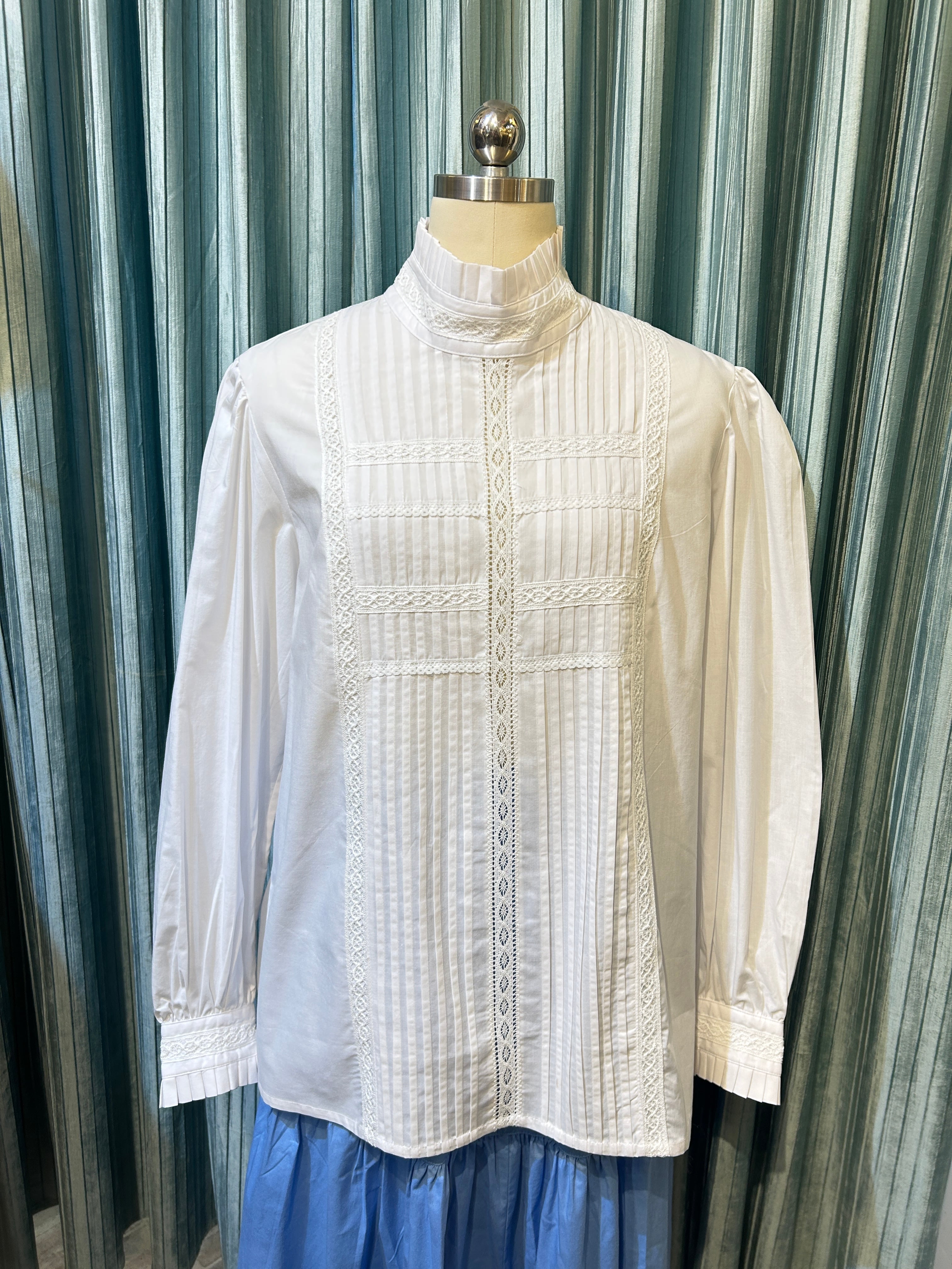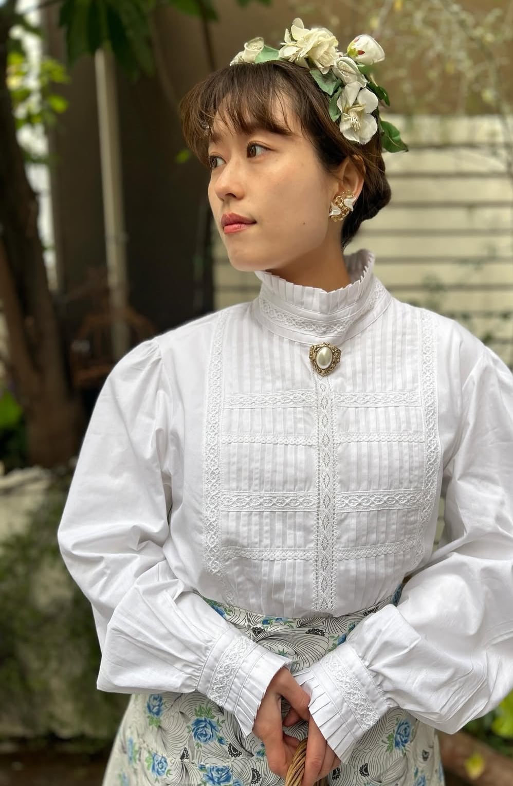 タックとレースが美しいホワイトブラウスはスタンドカラーでアンティークな雰囲気です♩
