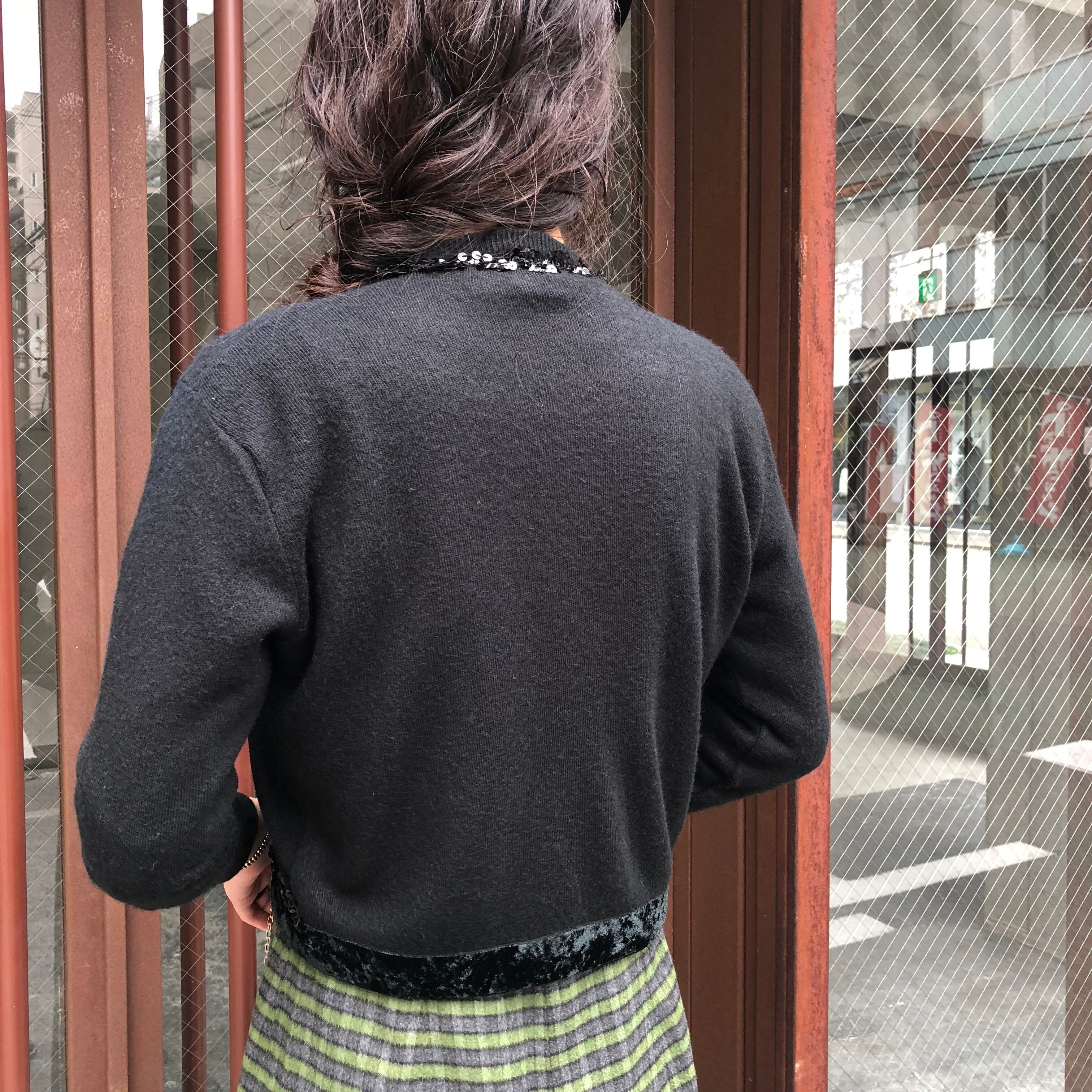 上品なベルベットのパイピングにリックラックのフォルムを描くように装飾されたスパンコールが目をひくカーディガン。