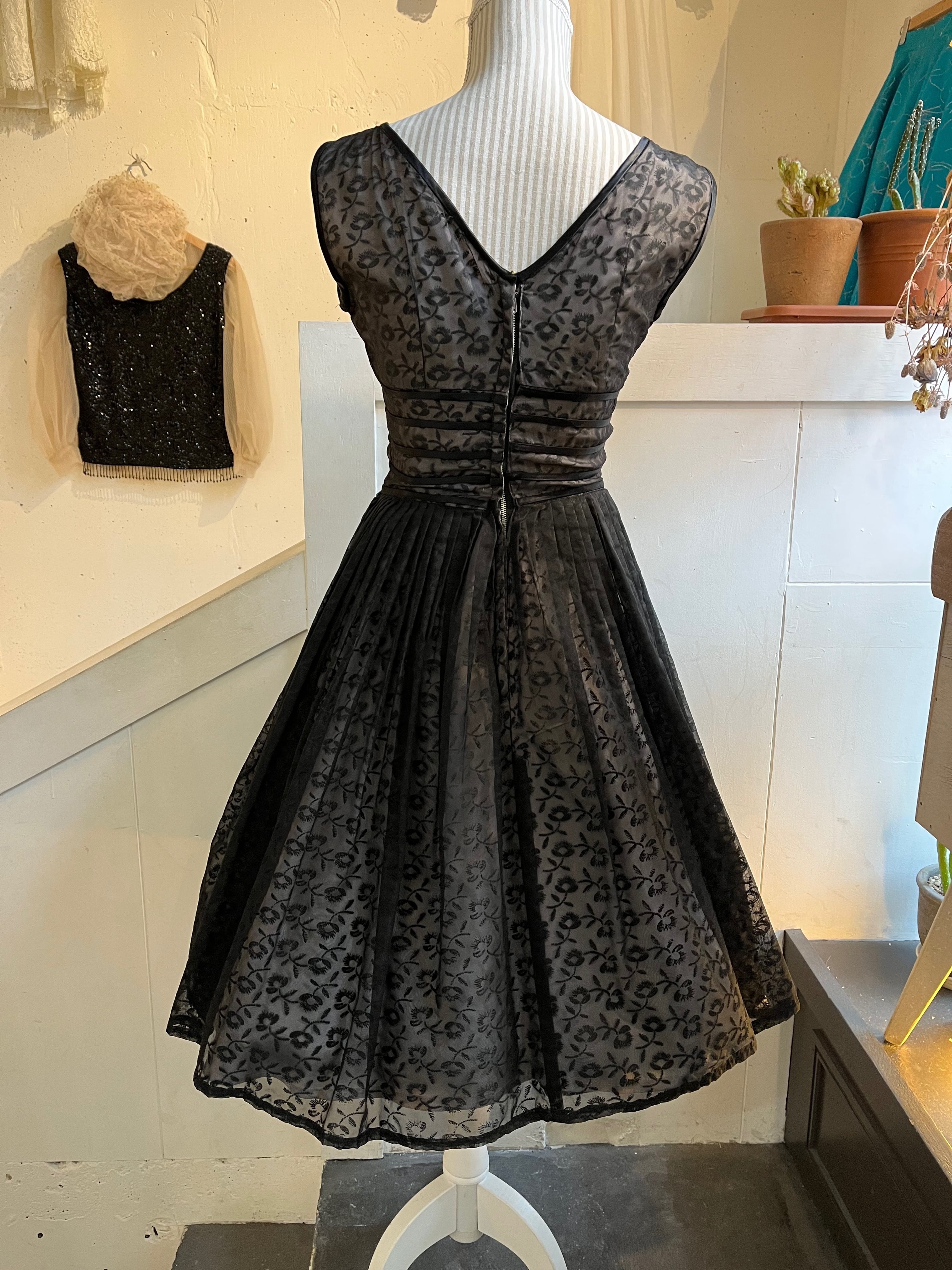 ブラックオーガンジーの透け感が女性らしく、フィット&フレアが美しいドレス。