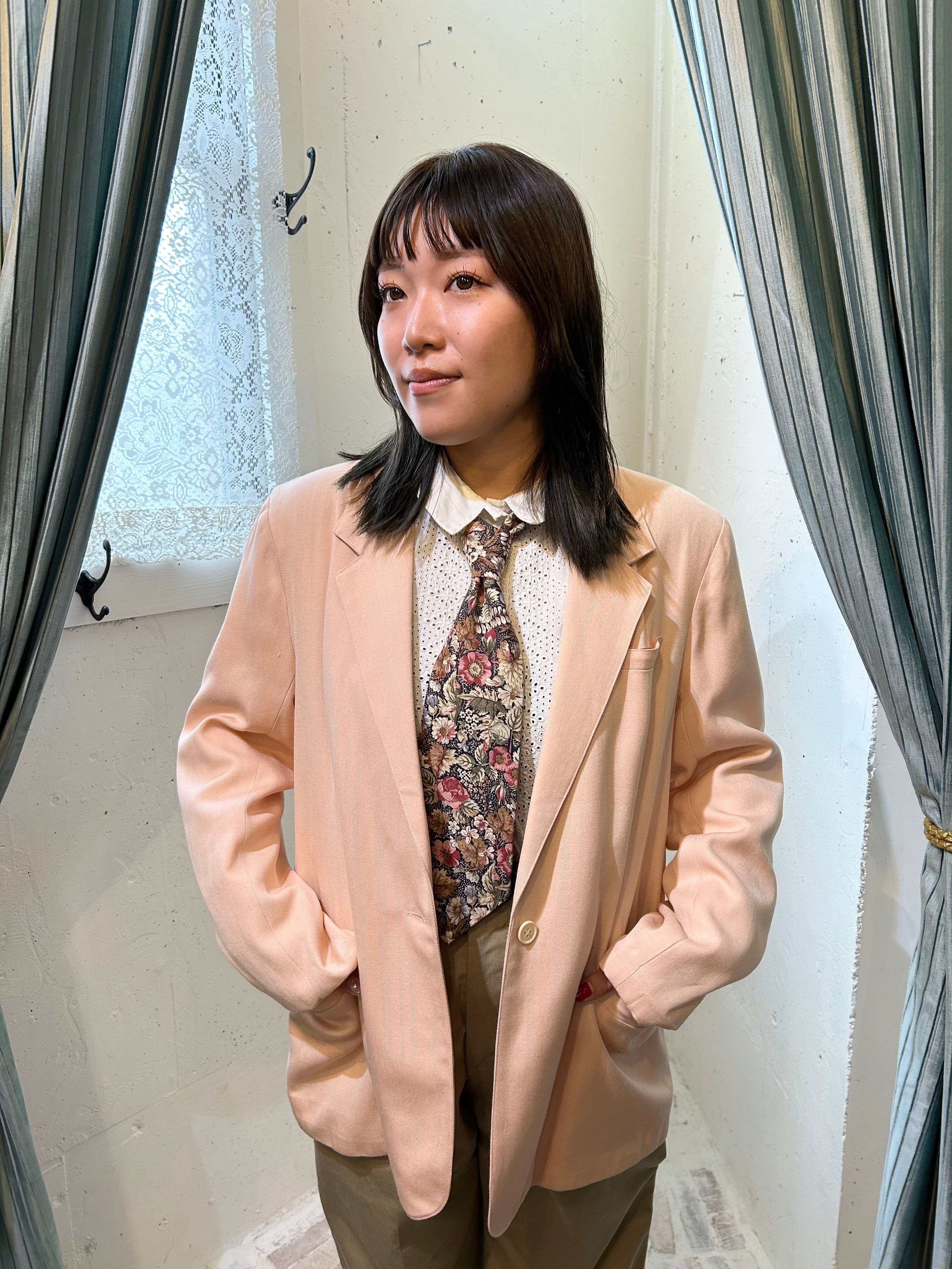ヘリンボーン織りのベビーピンクカラーのジャケット。