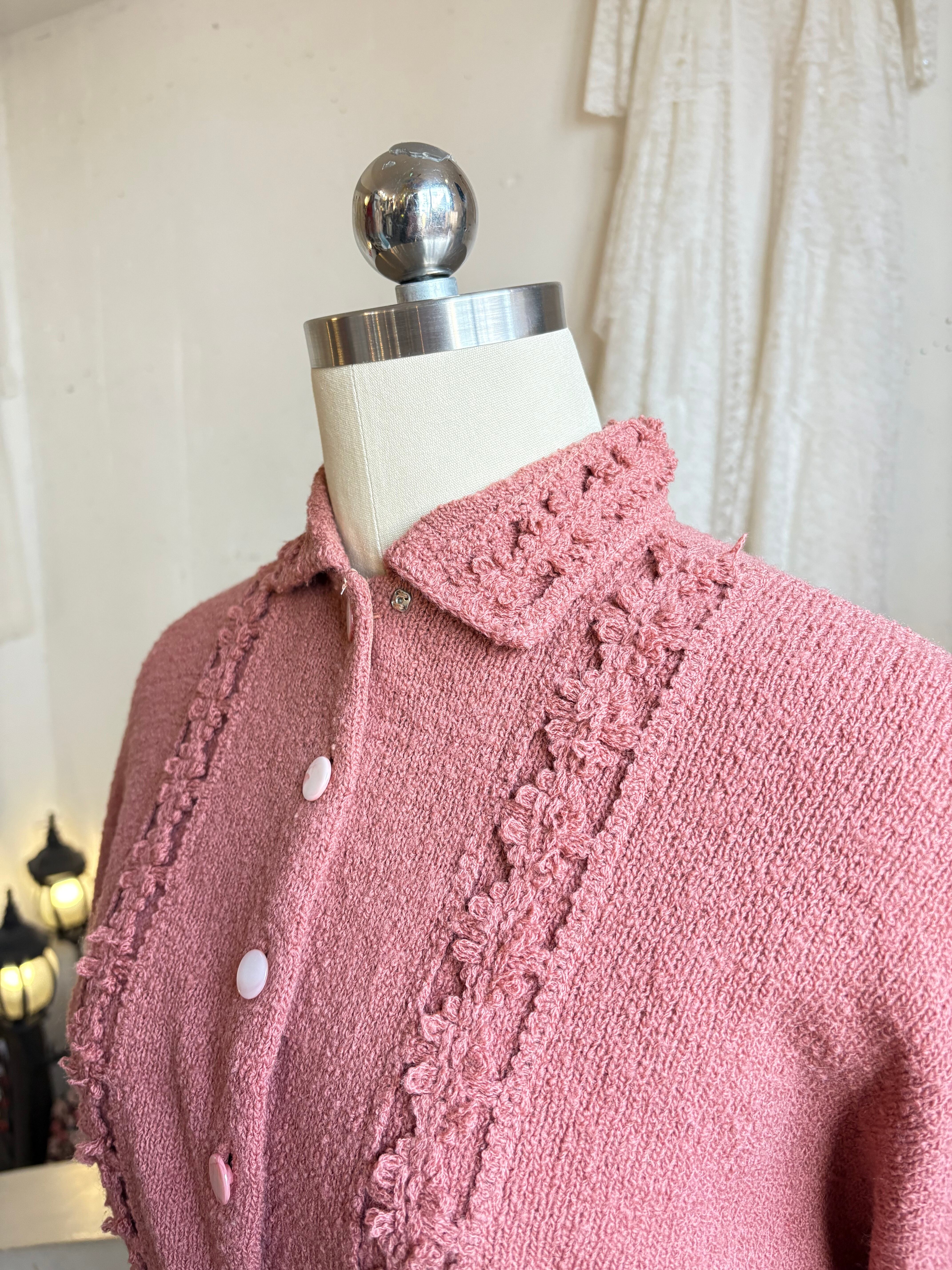 50's vintage "Brad ley" pink collar chenille knit cardigan
